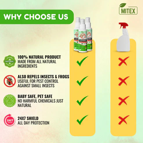 If you're looking for a safe, natural, and effective solution to eliminate lizards from your home, our Lizard Repellent Spray is the perfect choice. The Combo Pack is designed to tackle large, highly affected areas with ease, and its non-toxic, plant-based ingredients make it the go-to option for families, pets, and eco-conscious individuals. No more worrying about harmful chemicals—just fresh, natural protection that lasts!